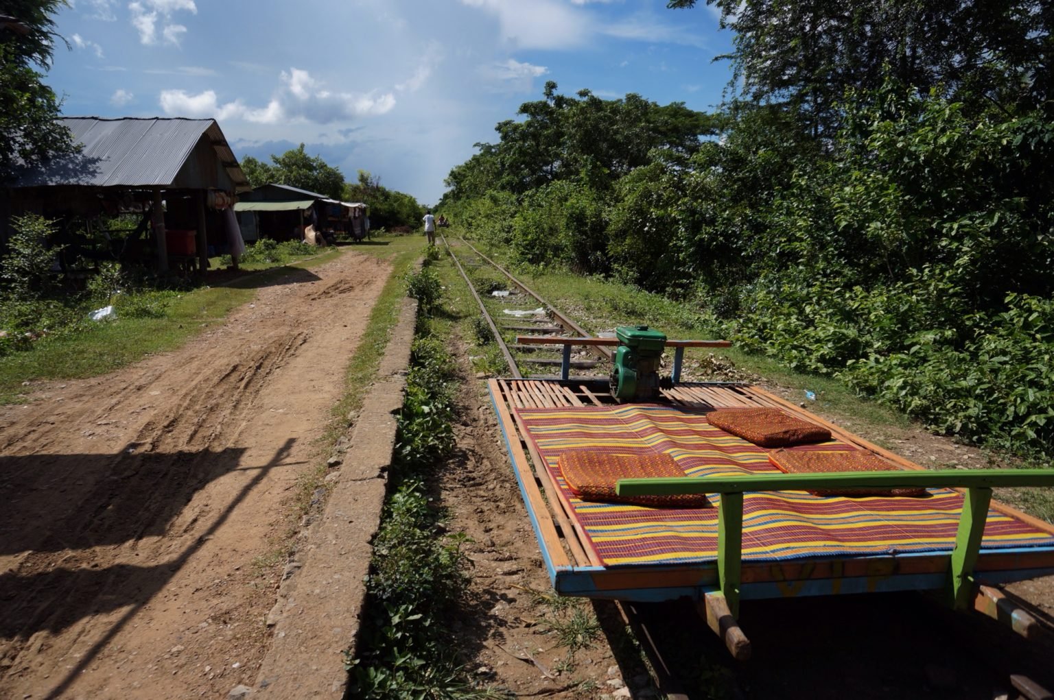 On part donc pour le bamboo train. Il s’agit d’une voie de chemin de fer datant des français. Comme c’est une voie unique utilisée pour transporter des marchandises, il ont résolu le problème de la voie unique avec des plateformes en bambou. Quand un autre bambou train arrive, le moins chargé décharge ses passage ou sa cargaison, on enlève la plateforme en bambou, on enlève les essieux et les roues et hop, la voie est libre. Le bamboo train est marrant à faire, on a l’impression d’aller sur vite. Maintenant, il ne faut pas trop compter dessus pour voir le paysage. C’est entouré de haie et seules quelques trouées permettent d’en profiter.