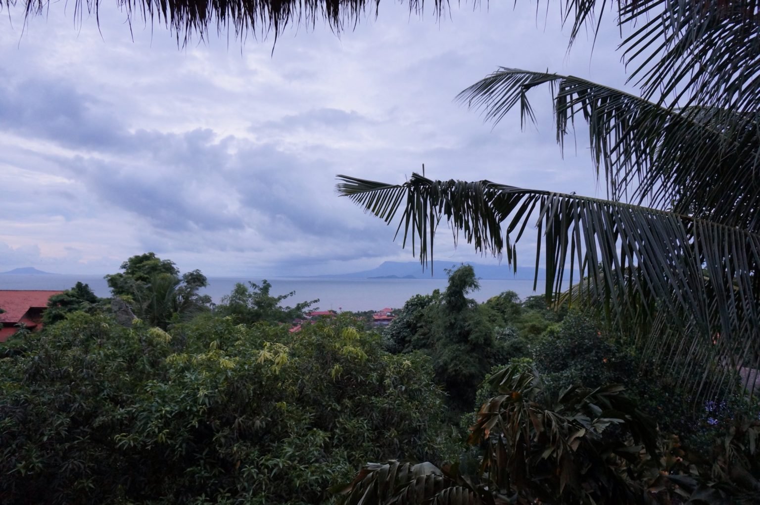 Mon bungalow comprend une belle chambre très bien meublée, une douche chaude séparée du reste de la salle de bain (ici, le pommeau de douche est souvent près des toilettes, sans zone délimitée) et une terrasse avec petit salon, canapés et hamac. Les fenêtres n’ont pas de vitres (c’est vraiment traditionnel) mais simplement des volets en bois. Là, je suis sur ma terrasse, au son des cigales, des grenouilles et occasionnellement du gecko. J’ai vu passer plusieurs fois de petites chauves-souris. J’encourage vivement grenouilles, geckos et chauves-souris à se bâfrer de moustiques. Il y en a mais ce n’est pas l’invasion non plus. C’est le bonheur. J’adore. Tout est beau.