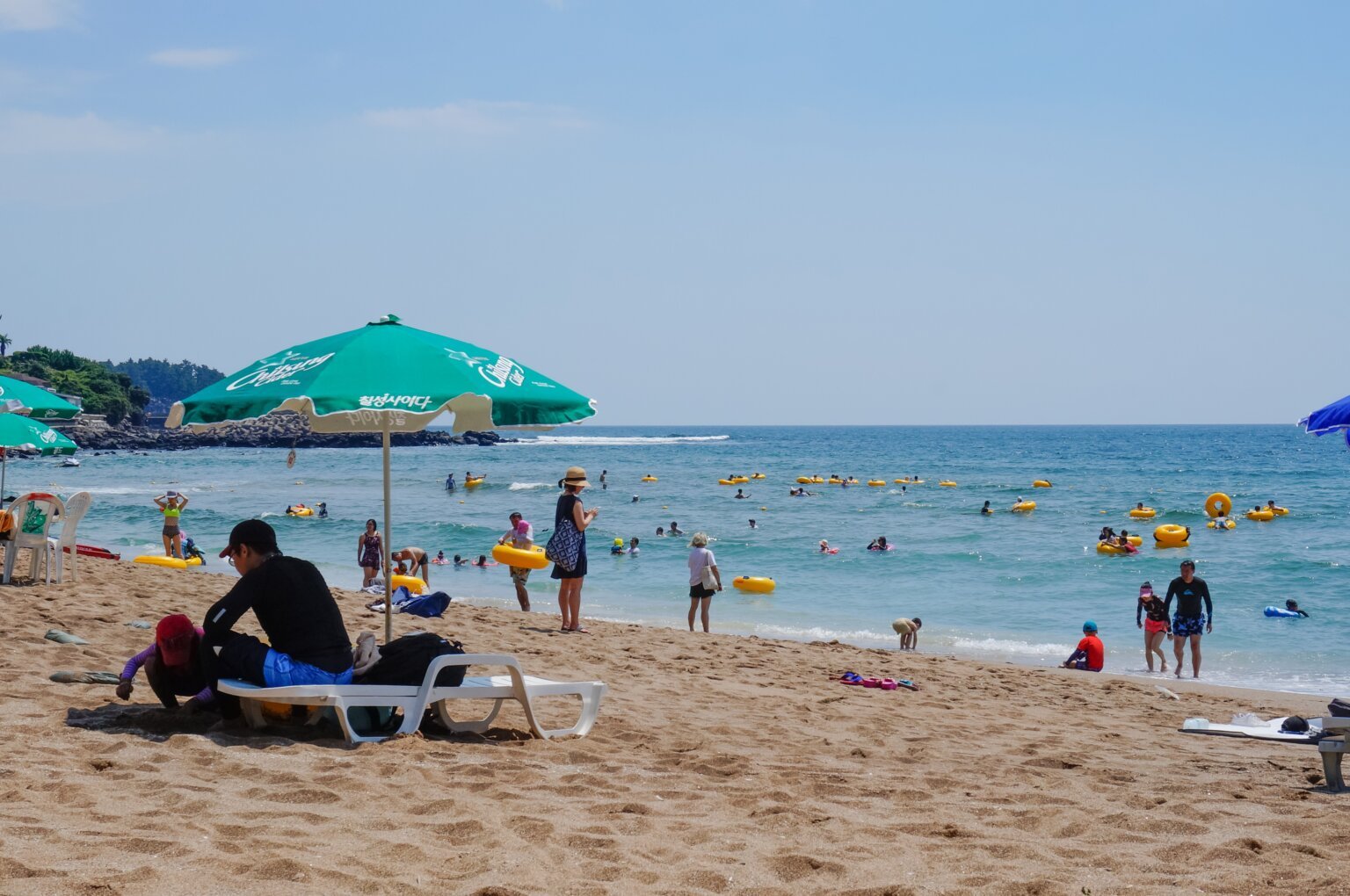 Sur la plage, je fais la connaissance de Chris, un anglais de Liverpool prof d’anglais en Corée. Il m’apprend que si tous les coréens ou presque se baignent avec une bouée ou un gilet flottant, c’est qu’ils ne savent pas nager. Et il faut dire que les rouleaux sont énergiques en bord de plage. Perso, si je ne savait pas nager, je ne sait pas si j’irais ! Et surtout quelle angoisse pour les maîtres-nageurs : une mer moyennement calme remplie de gens et d’enfants ne sachant pas nager !